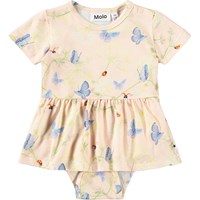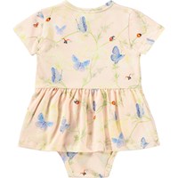 Ljusrosa klänning för de små i mjuk, ekologisk bomullsjersey med fjärilsmönster. Den är designad med en fastsydd body som knäpps med tryckknappar mellan benen, så att klänningen sitter på plats och är lätt att ta på och av.