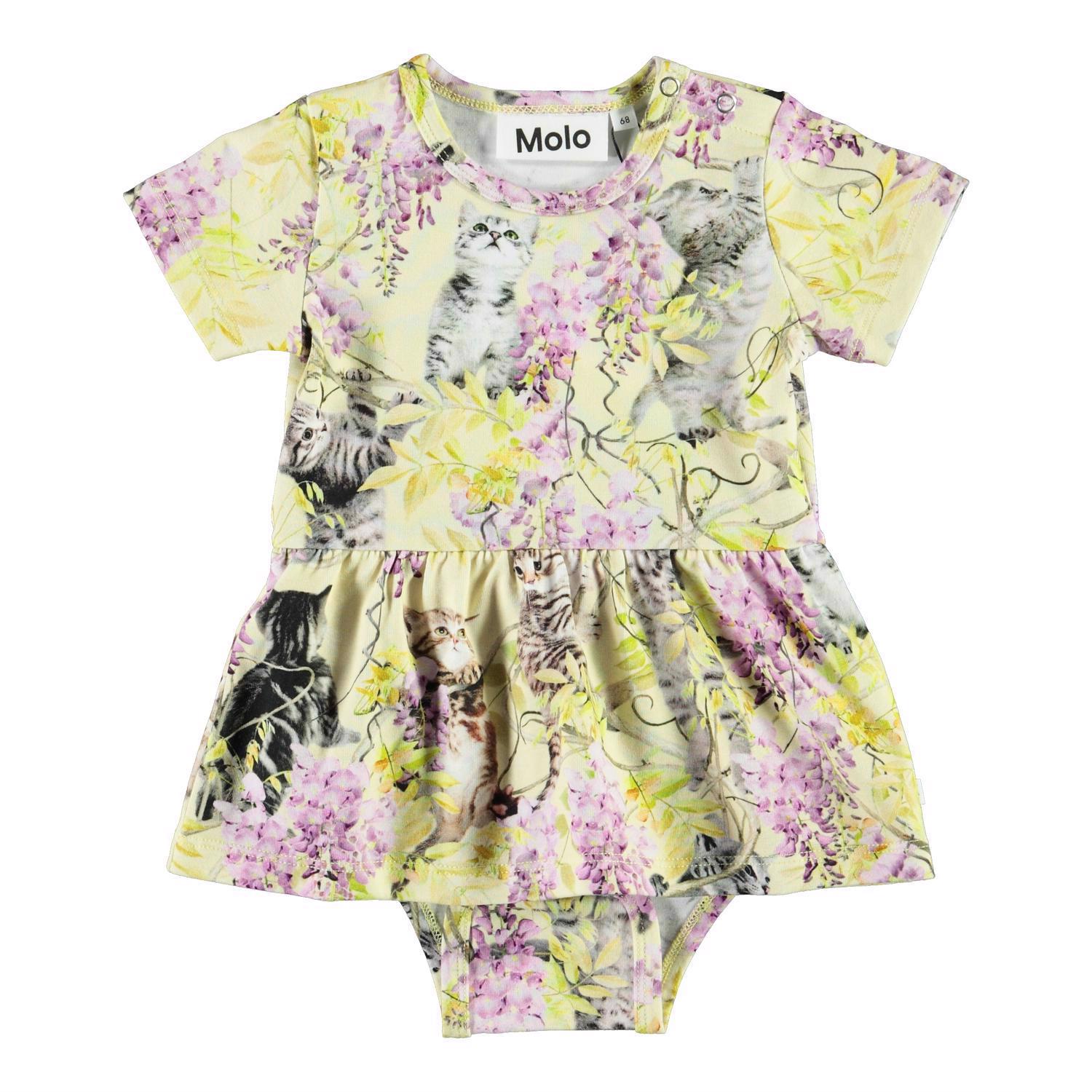 Frannie är en ljusgul babybody med kattungar som leker i blåregn. Frannie har korta ärmar, peplumkjol och tryckknappar på ena axeln och mellan benen vilket gör den enkel att ta av och på.