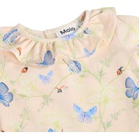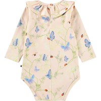 Långärmad, rosa body för de små i mjuk, ekologisk bomull med fjärilsmönster. Den har en volangkrage och tryckknappar på axlarna och mellan benen för enkel på- och avklädning.