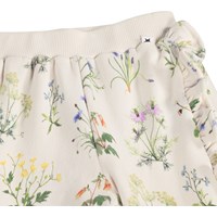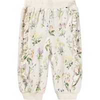 Mjuka vita byxor för de små i ekologisk bomull med blommönster. De har ribbning i midjan och vid anklarna, samt fina volangdetaljer.