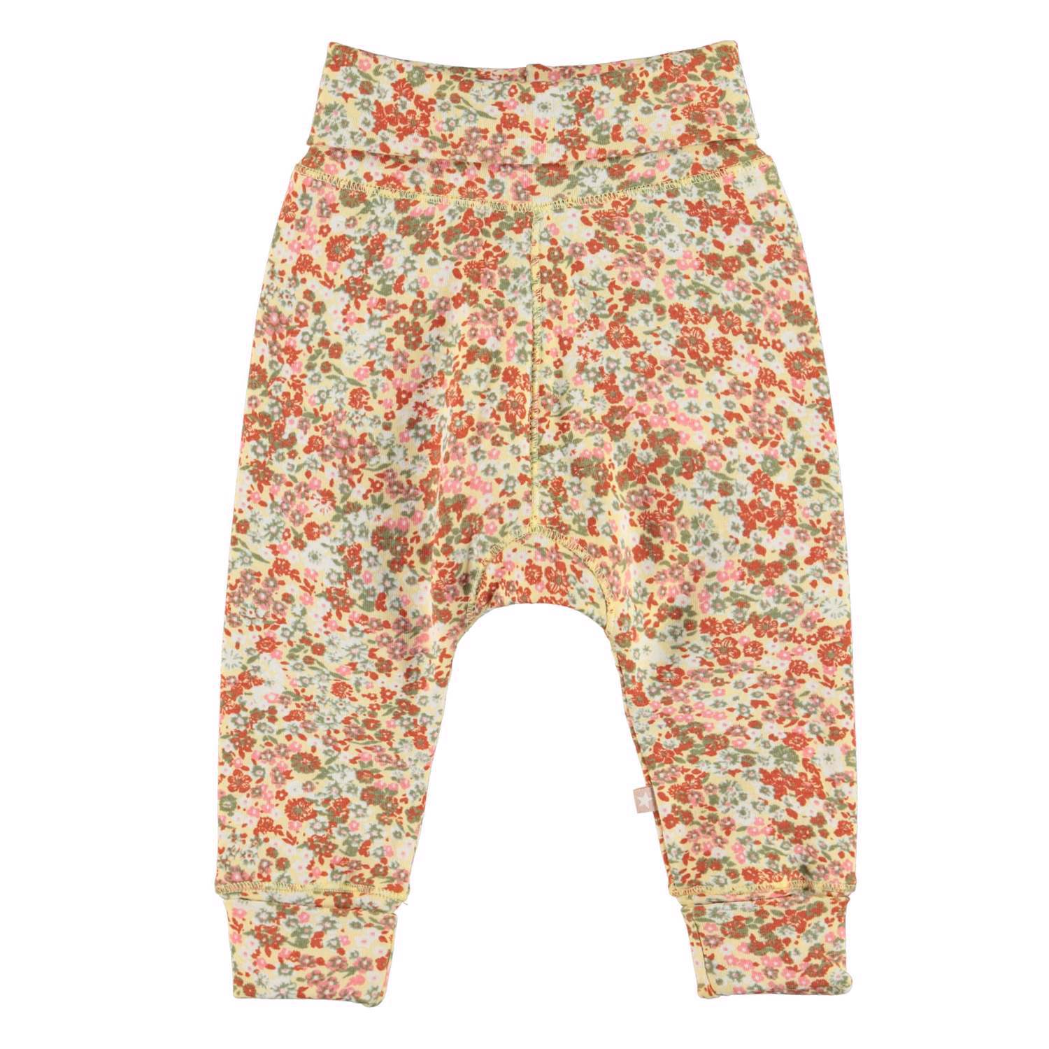 San är ett par mjuka babybyxor i blommigt mönster. Byxorna har en bred kant i midjan och vid besnlut som båda är vikta. Kombinera med matchande överdel.