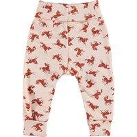 San er et par lyserøde baby bukser med print af små heste. Bukserne har en bred elastisk talje og benafslutning, hvor begge dele er ombukket.