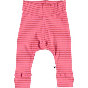 Sara är baby byxor i pink och röd randig ribb. Byxorna har bred resår i midjan, samt uppvik vid benen. Kombinera byxorna med matchande blus.