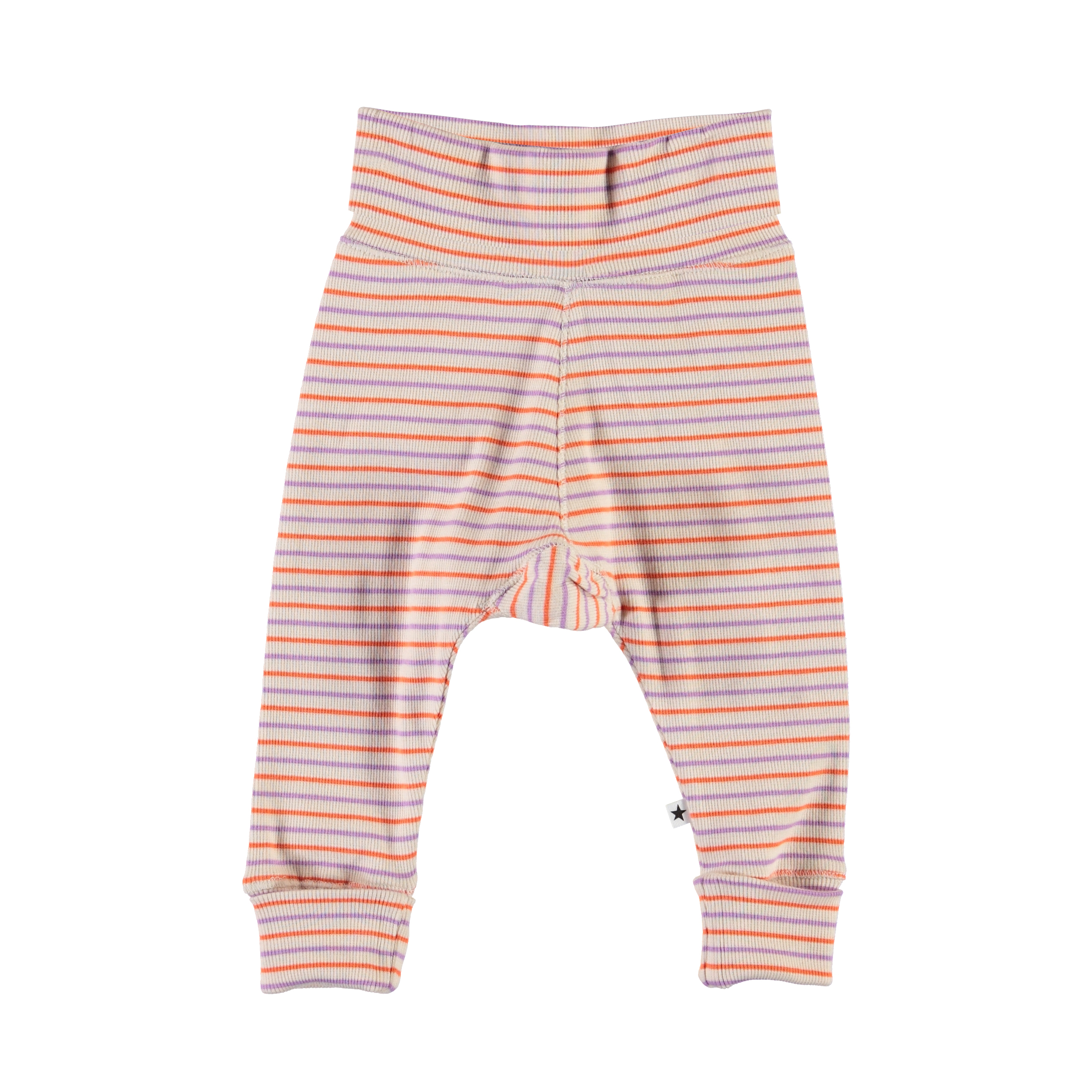 Sara är babybyxor i lila, orange och rosarandig ribb. Byxorna har bred resår i midjan, samt uppvik vid benen.