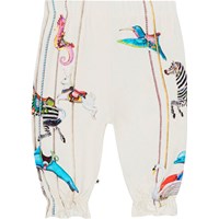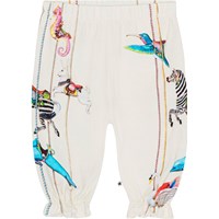 Råvita jerseybyxor till baby i ekologisk bomull. Byxorna har ribbkant i midjan och gummiband i benen vilket ger fyllnad och plats för rörelse. Byxorna har ett mönster med färgrika karuselldjur på sidorna.