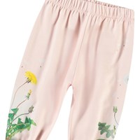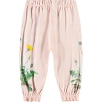 Byxor i ekologisk bomullsjersey för de små. Byxorna har resår i midjan och vid anklarna, vilket skapar en söt liten volang. De är rosa med ett maskrosmönster längs benen.
