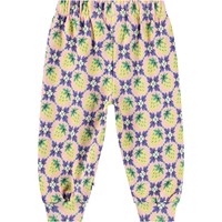 Mjuka byxor i ekologisk bomull för de små. Byxorna har en resår i midjan med snörning och muddar vid ankeln. De är lätta att ta på och av och har gott om utrymme för rörelse. Denna stil har en oborstad insida, vilket gör dem behagligt svala en varm dag. Byxorna har ett mönster av lila blommor och gula jordgubbar. Matcha med en matchande tröja för en komplett outfit.