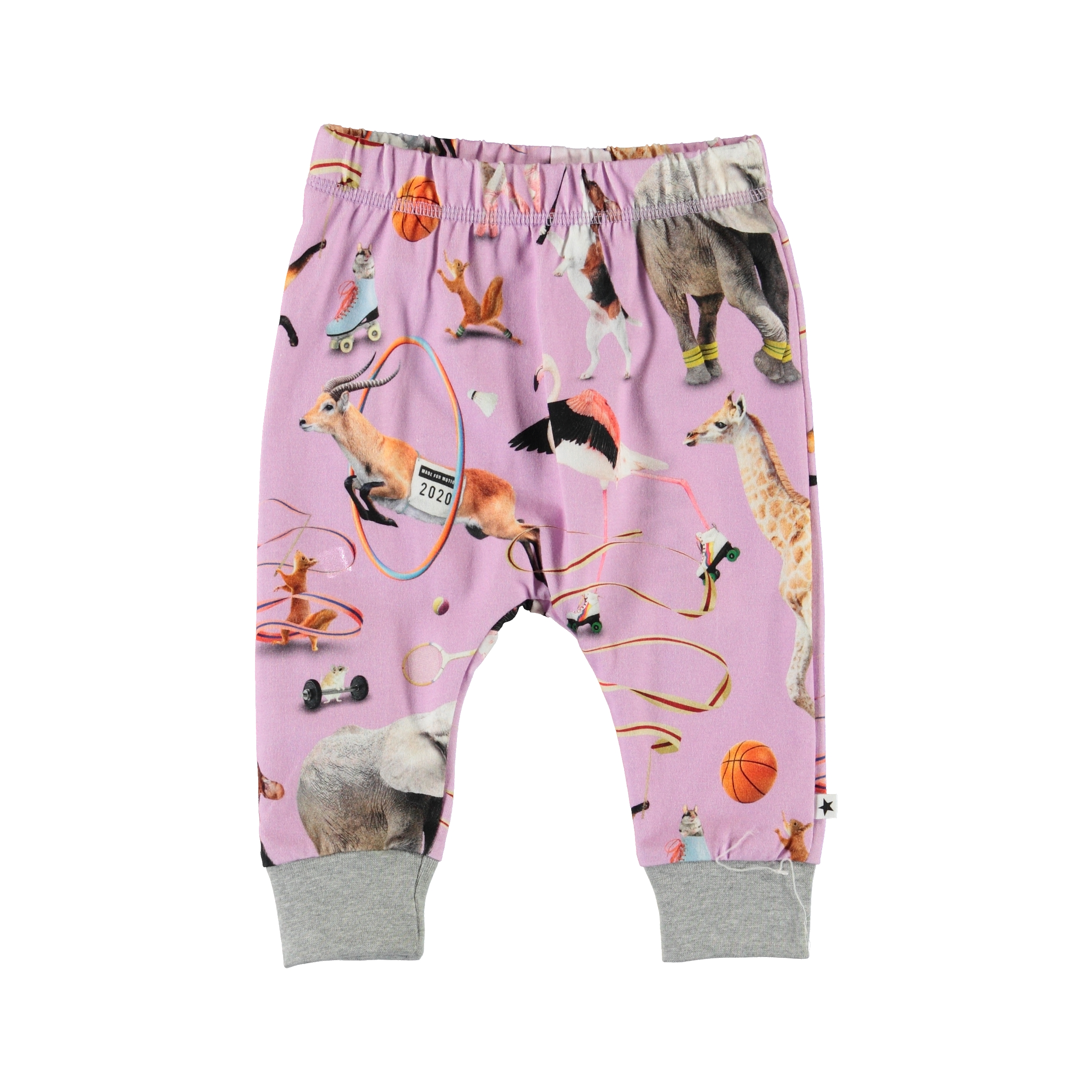 Simone är en lila babybyxa med olika djur som sportar. Byxorna har en elastisk midja, samt breda grå muddar vid bensluten.
