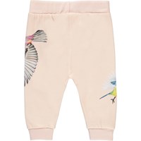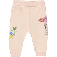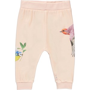 Susanne är ett par rymliga rosa babybyxor med fåglar på sidorna av benen. Byxorna har gummiband i midjan och ribbkant vid benslut, vilket säkrar en skön passform.