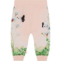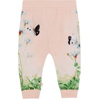 Rosa jerseybyxor till baby i ekologisk bomull. Byxorna har ribbkant i midjan och gummiband i benen vilket ger fyllnad och plats för rörelse. Byxorna har ett mönster med en klöveräng med svarta och vita fjärilar på sidorna av benen.