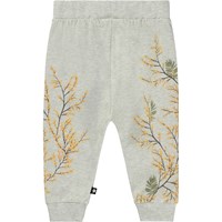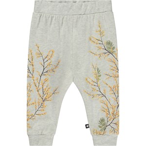 Ljusgrå babybyxor med grenar på sidorna av benen. Byxorna har gummiband i midjan och vid benslut.