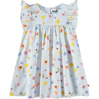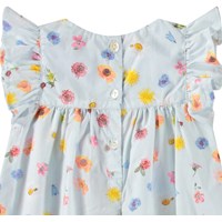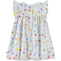 Klänning för de små i ekologisk bomullspoplin. Klänningen har små volangärmar, hög midja och knäppning med knappar i ryggen. Den är ljusblå med blommigt mönster.