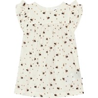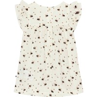 Vit ekologisk klänning till baby med ett mönster av blommor och humlor. Klänningen har rund hals, små volangärmar och knappar på ryggen.