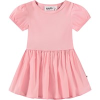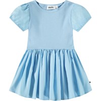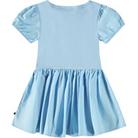 Ljusblå klänning i ekologisk bomull för de små. Klänningens topp har stretch, vilket säkerställer god rörlighet. Klänningen har en rund halsringning, korta puffärmar med resår och en cirkulär kjol. Ärmarna och kjolen är gjorda av poplin.