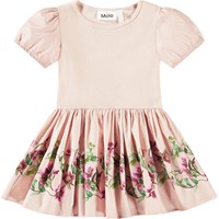Puderfärgad klänning för de små, tillverkad av ekologisk bomull. Klänningens överdel är tight i en ribbstickad jersey och har en rund hals. Den har också korta puffärmar med resår. Klänningens kjol är cirkelformad och tillverkad av poplin, vilket ger volym till klänningen med sina veck. Kjolen har ett vackert tryck av julrosor i vita och ljusrosa nyanser, som elegant flätar sig samman med sina gröna blad.