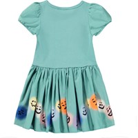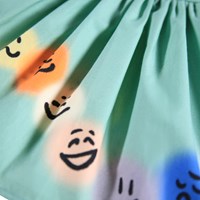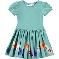 Grön klänning för de små i ekologisk bomull. Klänningens överdel har stretch för att säkerställa god rörlighet, en rund halsringning, korta puffärmar med resår och en rund kjol. Ärmarna och kjolen är gjorda av poplin. Kjolen har ett mönster av färgglada smileys i olika stämningar.