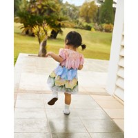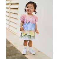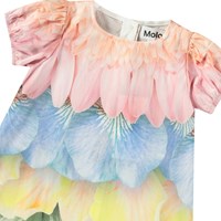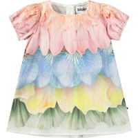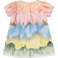 Klänning i ekologisk bomull för de små. Klänningen har en rymlig passform, puffärmar med resår och knappar längs ryggen, vilket gör den lätt att ta på och av. Klänningen är flerfärgad med fjädrar och blomblad.
