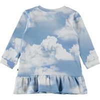 Calypso är en babyklänning med en liten kjol längst ner och tryckknappar på ena axeln. Klänningen är ljusblå med ett tryck av moln.