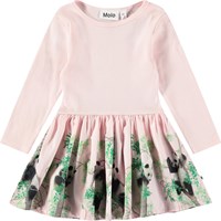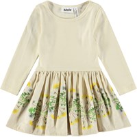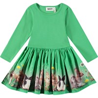 Långärmad klänning för de små i ekologisk bomull. Klänningen är grön med kaniner och maskrosor på kjolen. Toppen är åtsittande i ribbad jersey, medan kjolen är i poplin som ger fin volym. Den är lätt att ta på och bekväm att bära.