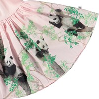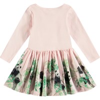 Långärmad klänning för de små i ekologisk bomull. Klänningen är rosa med söta pandor på kjolen. Toppen är åtsittande i ribbad jersey, medan kjolen är i poplin som ger fin volym. Den är lätt att ta på och bekväm att bära.