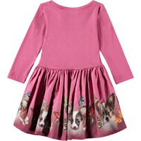 Mörkrosa långärmad klänning i ekologisk bomull för de små. Toppen är åtsittande i en ribbstickad jersey, och kjolen är i poplin, vilket ger klänningen volym. Klänningen är lätt att ta på och bekväm att bära. Kjolen har ett tryck av hundvalpar och färgglada fjärilar.