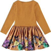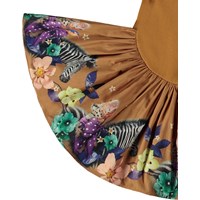 Brun långärmad klänning i ekologisk bomull för de små. Toppen är åtsittande i en ribbad trikå och kjolen är gjord av poplin, vilket ger klänningen volym. Klänningen är lätt att ta på och bekväm att ha på. Kjolen har ett mönster av zebrafärgade katter och färgglada blommor.
