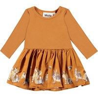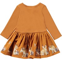 Candi är en babyklänning i tvådelad look med långa ärmar. Överdelen är orange i ribb och kjolen med olika djur.