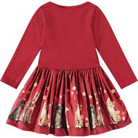 Röd långärmad klänning i ekologisk bomull för de små. Toppen är åtsittande i ribbad jersey, och kjolen är gjord av poplin, vilket ger klänningen volym. Den är lätt att ta på och bekväm att bära. Klänningens kjol har ett tryck av söta, lekfulla kattungar under en himmel av små vita blommor.