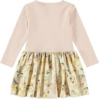 En rosa långärmad klänning tillverkad av ekologisk bomull för de små. Toppdelen är åtsittande i en ribbad jersey och har en rund hals med en knapp på axeln, vilket gör den enkel att ta på. Klänningen har en tryck av en akvarellmålad kattansikte.