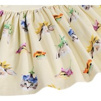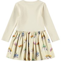 Långärmad, gul klänning för de små i ekologisk bomull med djurmotiv på kjolen. Toppen har en åtsittande passform av mjuk, ribbad jersey, medan kjolen har fin volym. Tryckknappen på axeln gör den lätt att ta på och av.