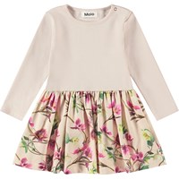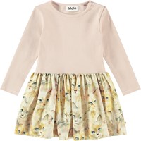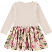 Beige långärmad klänning i ekologisk bomull för de små. Toppen är åtsittande i en ribbad jersey och har en rund hals med en knapp på axeln, vilket gör det enkelt att ta på klänningen. Klänningens kjol har ett tryck av rosa och vita julrosor.