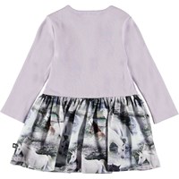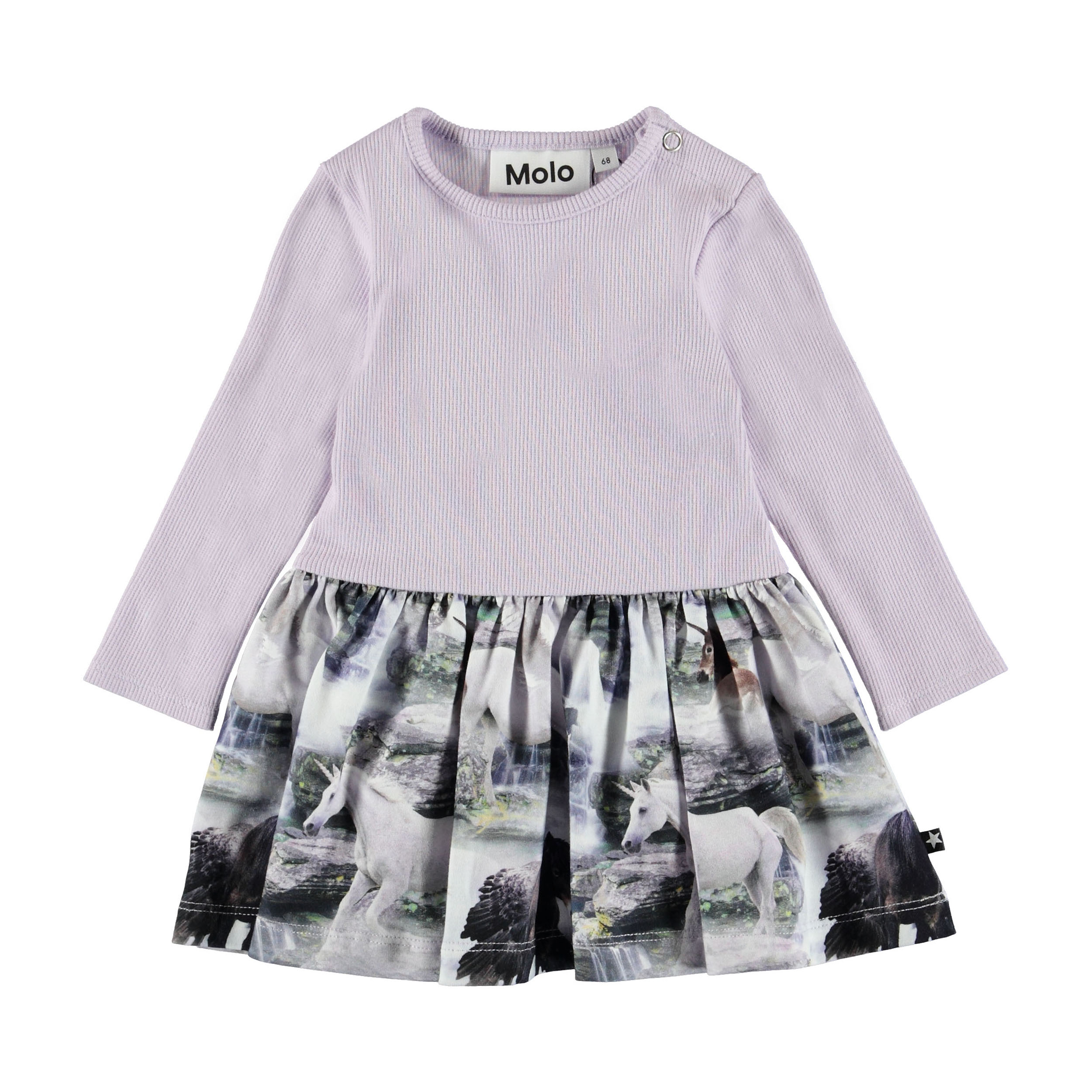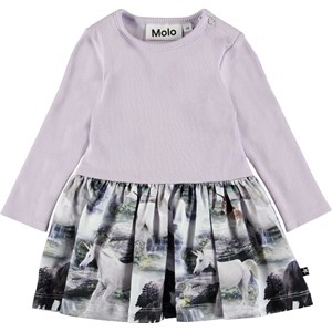 Carel är en långärmad baby klänning i tvådelat look med rosa ribbad överdel och trycket 'Mythical Creatures' på nederdelen.