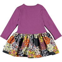 Carel är en baby klänning i tvådelad look med långa ärmar. Överdelen är i lila ribb, och volangen är med färgrikt patchwork tryck.