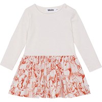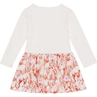 Vit ekologisk klänning med rött mönster på kjolen, till baby. Mönstret består av röda handteckande hästar. Klänningen har en rund hals, tryckknappar, långa ärmar och rundad kjol.