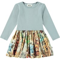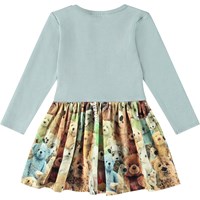 Blå långärmad klänning för de små, tillverkad av ekologisk bomull. Toppen är åtsittande i ribbstickad jersey med en rund hals och en knapp på axeln, vilket gör den lätt att ta på och bekväm att ha på. Klänningen har ett tryck av mjuka och bedårande teddybjörnar i alla möjliga färger och former.
