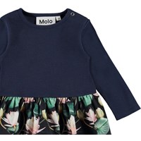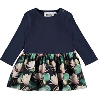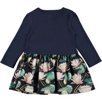 Carel är en babyklänning i två delar med långa ärmar. Den övre delen är i mörkblå och ribbad, medan kjolen har ett tryck av rosa näckrosor.