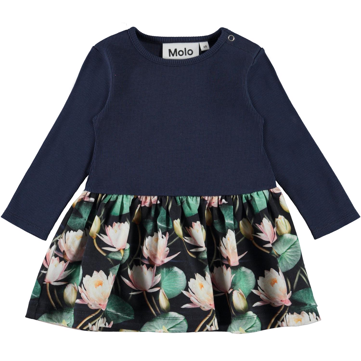 Carel är en babyklänning i två delar med långa ärmar. Den övre delen är i mörkblå och ribbad, medan kjolen har ett tryck av rosa näckrosor.