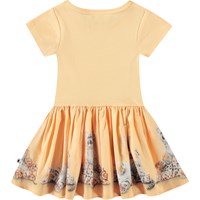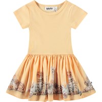 Kläder för de små i ekologisk bomull. Klänningen är ljusorange med djurungar på kjolen. Toppen är åtsittande i ribbad jersey, medan kjolen är i poplin, vilket ger klänningen volym. Den är lätt att ta på och bekväm att bära.