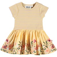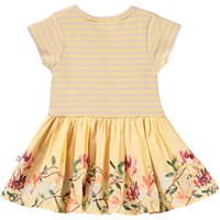 Carin är en ljusgul tvådelad babyklänning med korta ärmar. Toppen är ribbad med tunna rosa och ljusgula ränder. Kjolen är peplum men fina rankor.