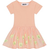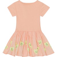 Persikofärgad ekologisk klänning med mönster på kjolen till baby. Mönstret består av så gula smileyhjärtan. Klänningen har en rund hals, korta ärmar och rundad kjol.