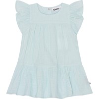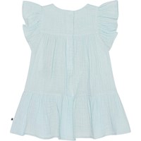 Ljusblå ekologisk klänning till baby. Klänningen har rund hals, små ärmar med rynkning och tryckknappar på ryggen.