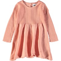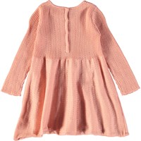 Långärmad, stickad baby klänning i puderfärgad ull. Klänningen har ett bedårande hålmönster och knappar längs ryggen.