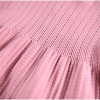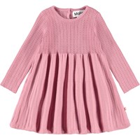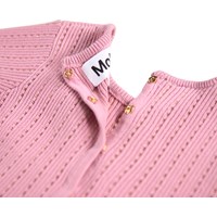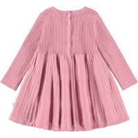 Rosarandig långärmad stickad klänning för de små i ekologisk bomull. Klänningen är stickad med en metalltråd, har fin volym och knappar på baksidan.