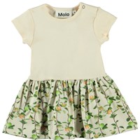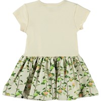 Catja är en cremefärgad bbyklänning med mönstrad kjol, i 100% ekologisk bomullsjersey. Klänningen har korta ärmar och tryckknappar vid axeln, som gör den enkel att ta av och på. Kjolen är mönstrad med massor av äpplegrenar fyllda med äpplen.