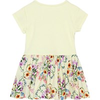 Ljusgul ekologisk klänning till baby med mönster på kjolen. Mönstret består av färgrika blommor som bildar både hjärtan och klöver. Klänningen har en rund hals, stängs med tryckknappar, korta ärmar och rundad kjol.