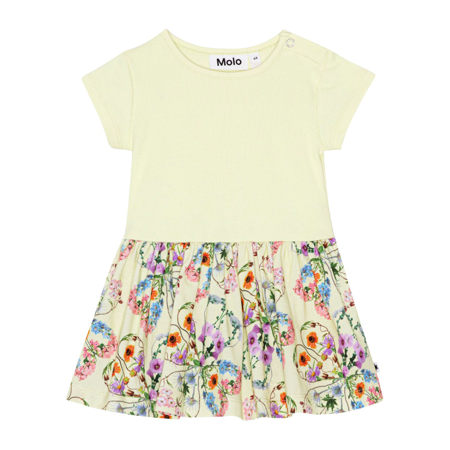 Ljusgul ekologisk klänning till baby med mönster på kjolen. Mönstret består av färgrika blommor som bildar både hjärtan och klöver. Klänningen har en rund hals, stängs med tryckknappar, korta ärmar och rundad kjol.
