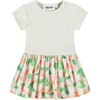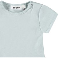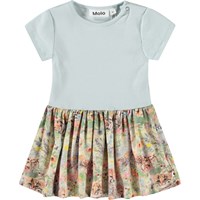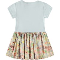 Klänning för de små i ljusblå med söta djurbabys i en blomsterbädd på kjolen. Toppen är åtsittande i ribbad jersey och har en rund hals med en knapp på axeln, vilket gör den enkel att ta på och av.