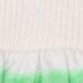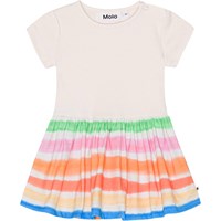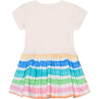 Vit ekologisk klänning till baby med mönster på kjolen. Mönstret består av multifärgade ränder. Klänningen har en rund hals, stängs med tryckknappar, korta ärmar och rundad kjol.
