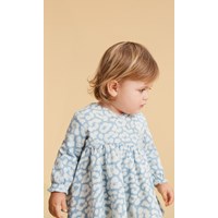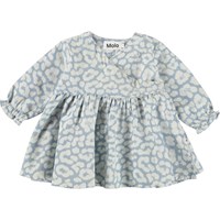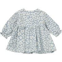 Caysa är en fin babyklänning i blått leopardmönster. Klänningen har omlotteffekt.