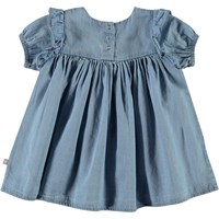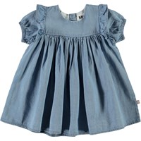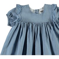 Chanda är en ljusblå jeansklänning med korta ärmar. Klänningen har fin volym och små volangkanter på axlarna.